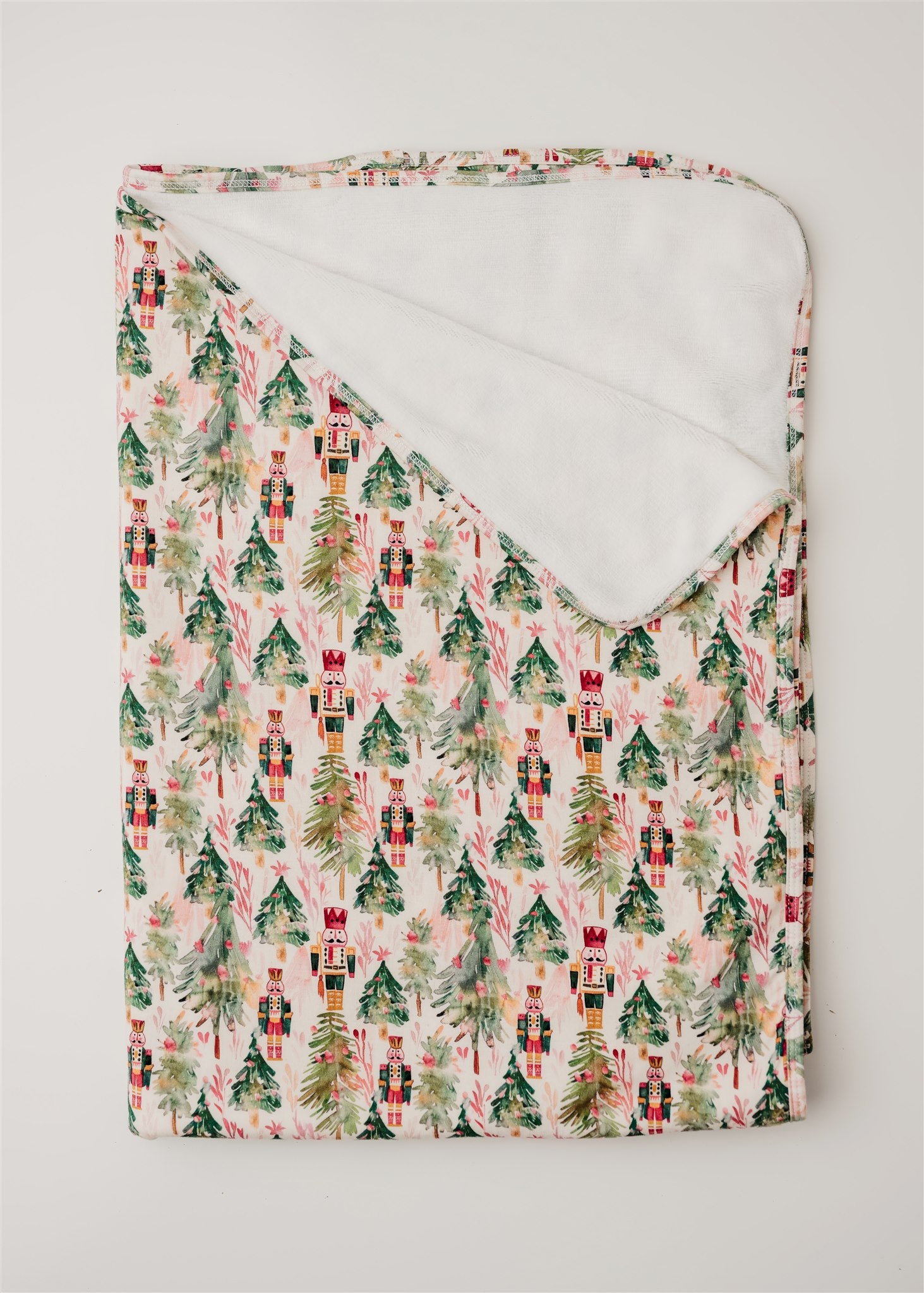 Step into a winter wonderland with the Enchanted Nutcracker Swaddle Blanket. Featuring whimsical nutcracker and forest pines in soft shades of pink, green, and gold, this magical print brings holiday cheer to every snuggle.