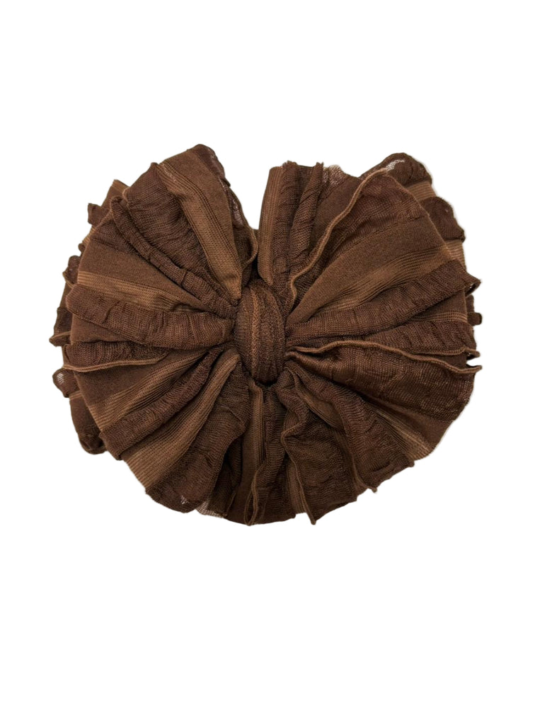 This charming Ruffled Headband in Brown is crafted from a unique custom-dyed ruffled material, offering the perfect balance of softness and stretch for a comfortable fit. Designed to fit newborns and grow with your baby, this headband stretches to stay snug and cozy as your little one grows. Featuring a beautiful 4.5-inch wide bow made from a polyester spandex blend, it adds a rich, earthy touch to any outfit. With a circumference of 13 inches, this headband is versatile enough to dress up or down for any occasion. Hand-tied with love by moms in Dallas, TX, this is our #1 selling product that both moms and babies adore! Keep your little one looking stylish and adorable with this must-have headband from Rockin Royalty!