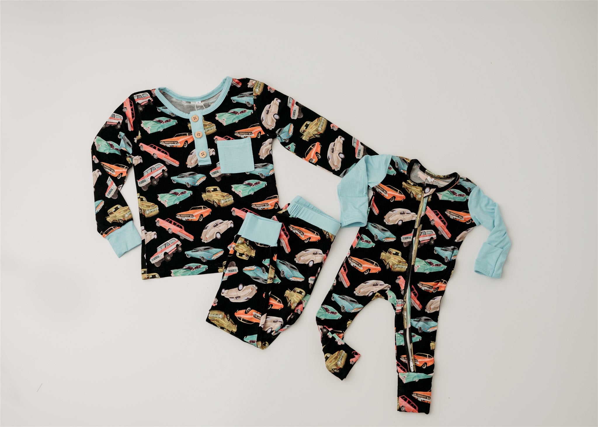 Rev up bedtime with our Classic Cruiser Toddler Set! Featuring hand-drawn retro cars in vintage hues of mint, coral, mustard, and teal on a sleek black backdrop, this print is perfect for your little speedster.
