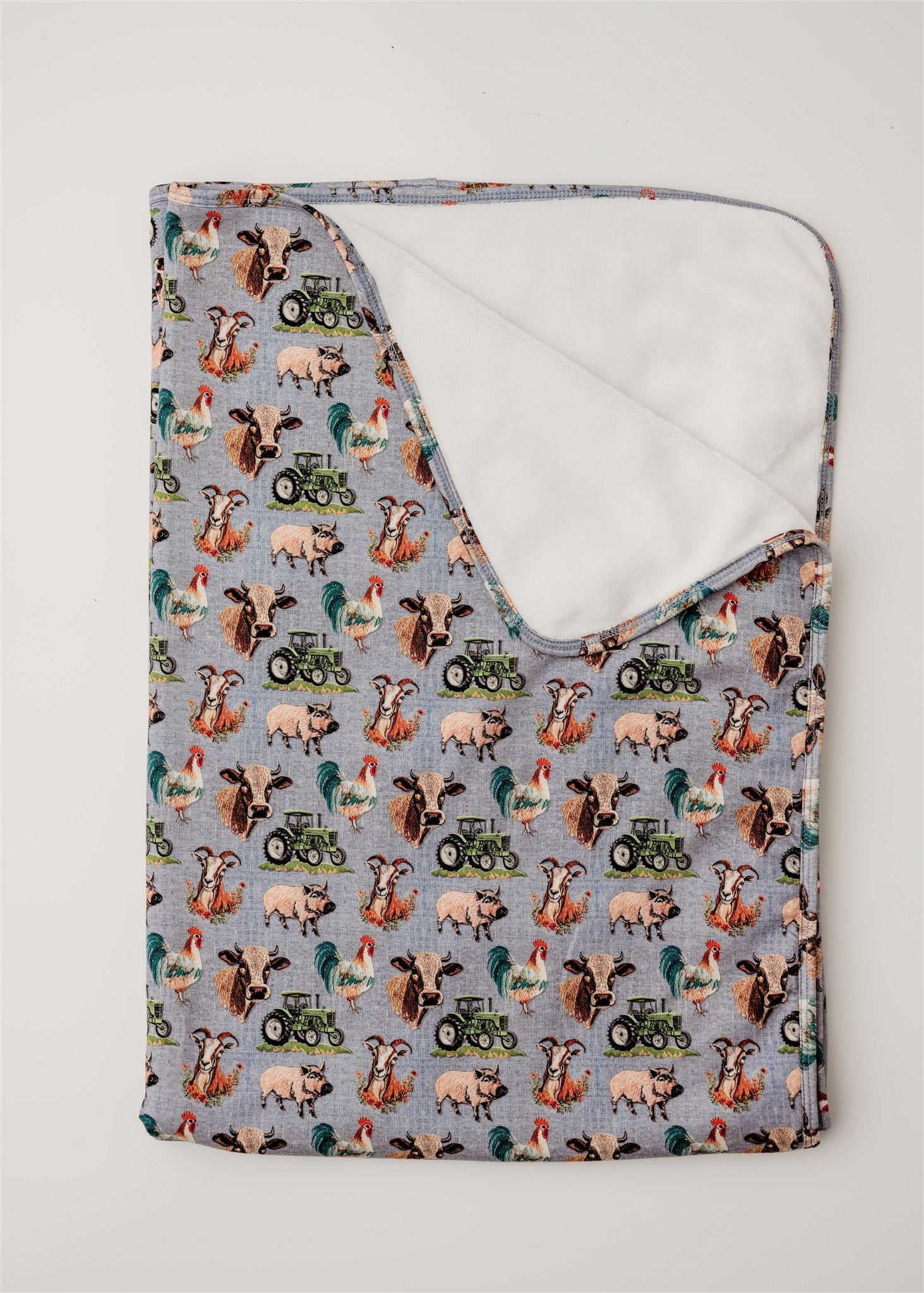 🐷 The Down on the Farm print features tractors, cows, pigs, roosters, and goats — bringing playful barnyard fun to every cuddle. Ideal for newborn photos, baby showers, or everyday use.