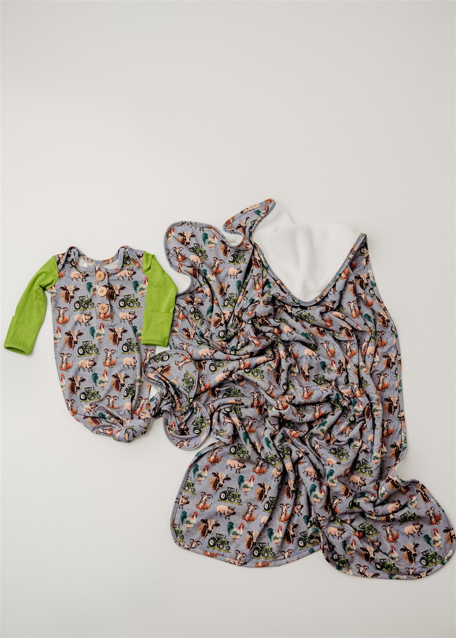 Say hello to the Down on the Farm Swaddle Blanket — the perfect mix of softness, comfort, and country charm! Made from our signature buttery soft viscose from bamboo on one side and backed with our dreamy plush fabric on the other, this blanket is lightweight yet cozy — perfect for snuggles, tummy time, or on-the-go comfort.
