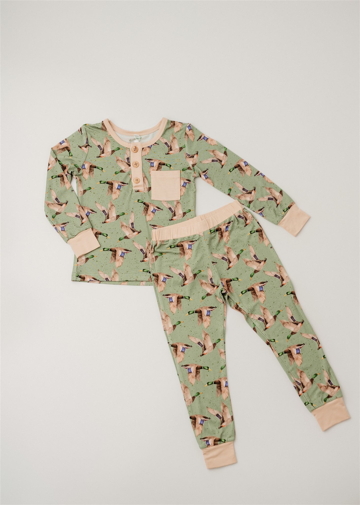 Let your little one drift into dreamland with the Mallard Skies Toddler Set! This charming print features beautifully illustrated flying mallards against a soft sage sky perfect for your little outdoorsman or nature lover.
