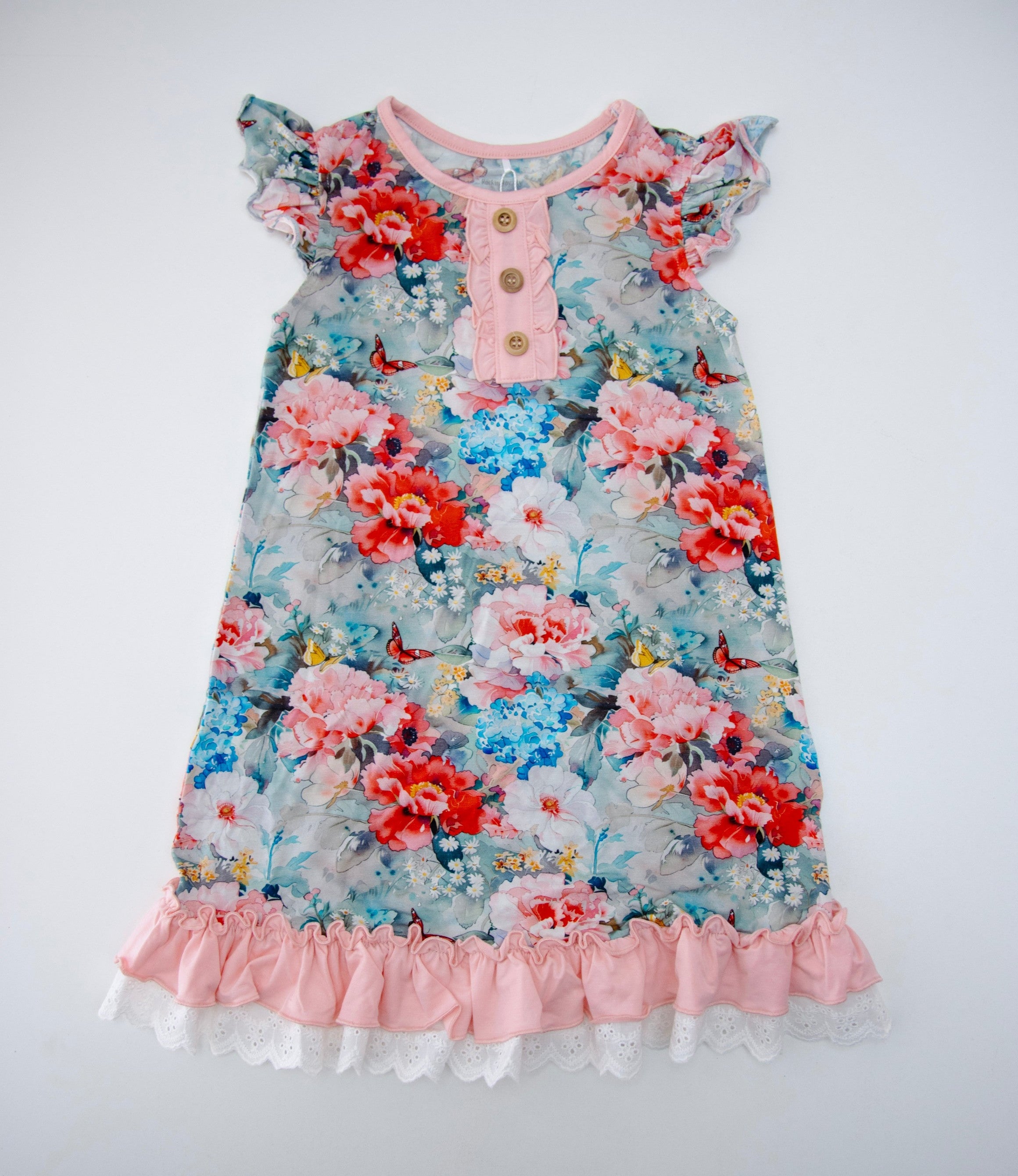 The lightweight bamboo fabric keeps her cool in the summer and cozy in cooler months, while the stretchy, tag-free design allows for maximum movement and all-night comfort. Flutter sleeves, a ruffled button placket, and a lace-trimmed double ruffle hem create the signature Rockin Royalty look — perfect for matching sisters, sibling sets, and picture-perfect mornings.