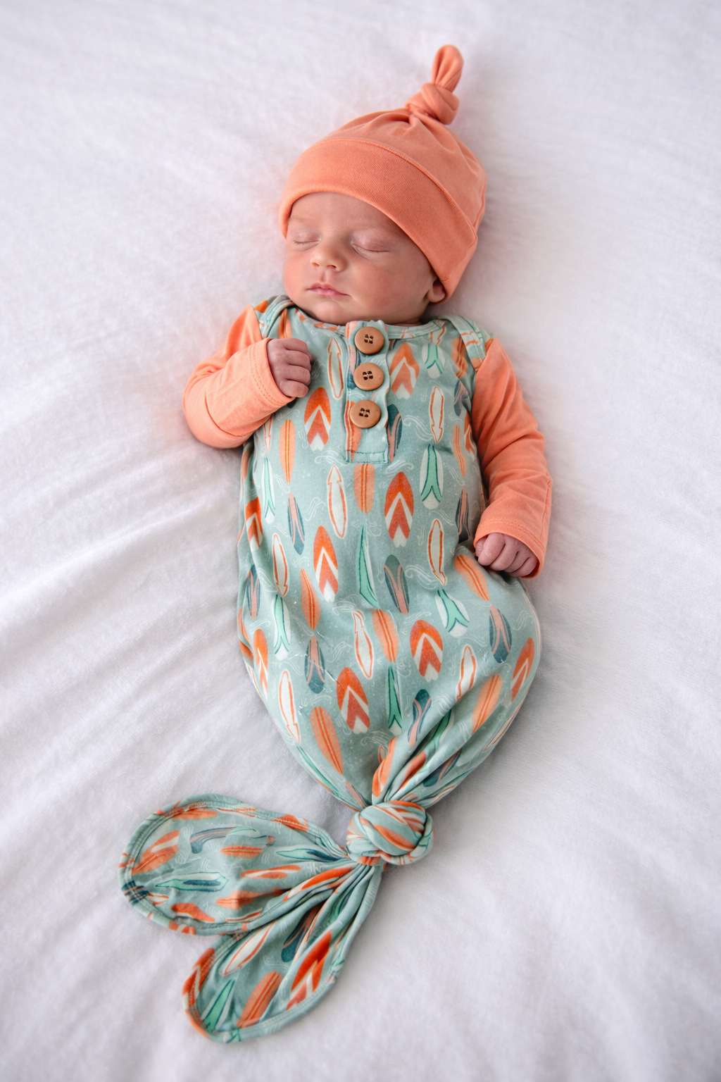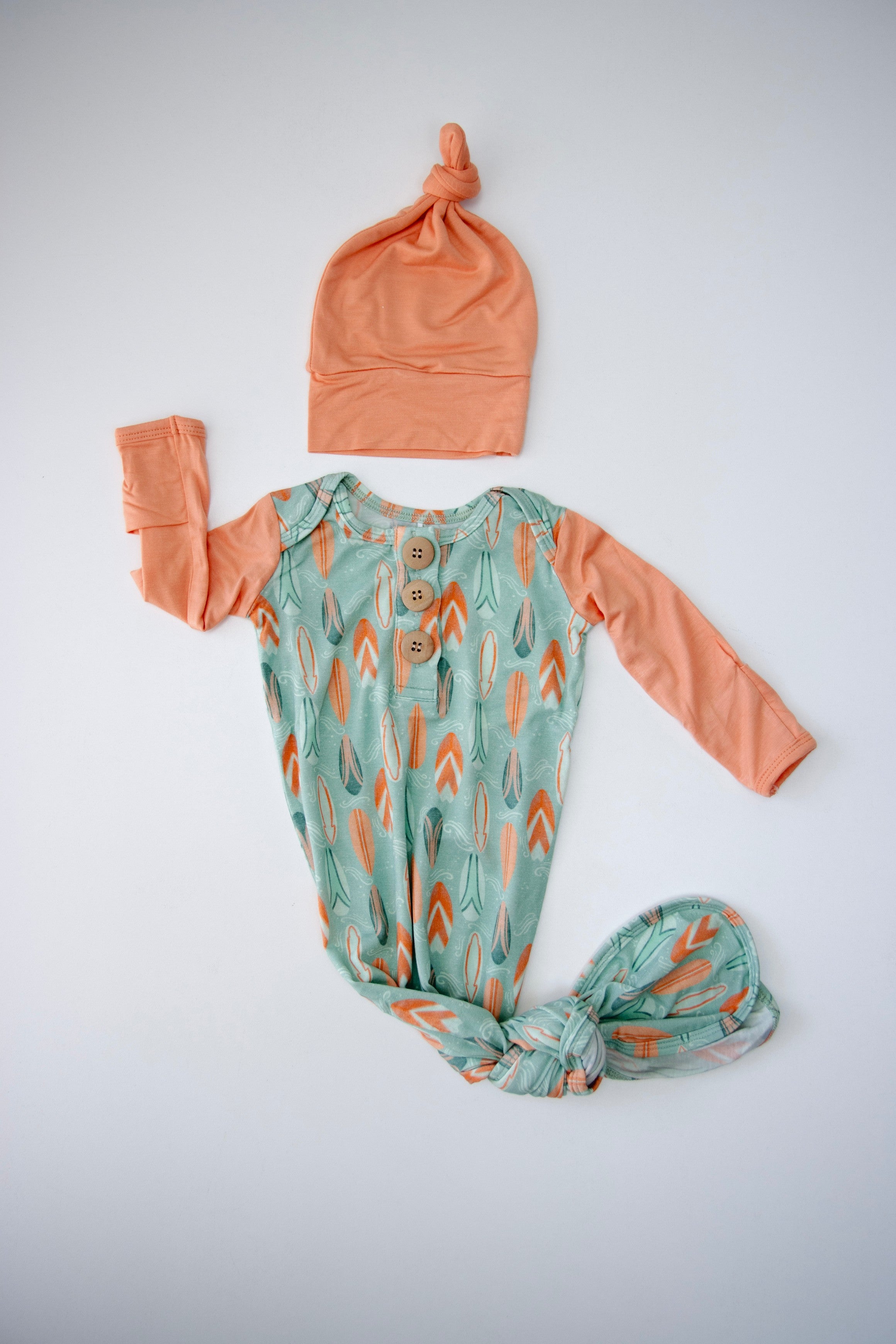 The adjustable tie-knot bottom allows for quick diaper changes and a customizable length as your little one grows, while the fold-over hand cuffs help prevent tiny scratches. Finished with wood-style buttons and a perfectly coordinated top-knot hat, this set brings a relaxed, beachy feel to your coming-home outfit and everyday moments.