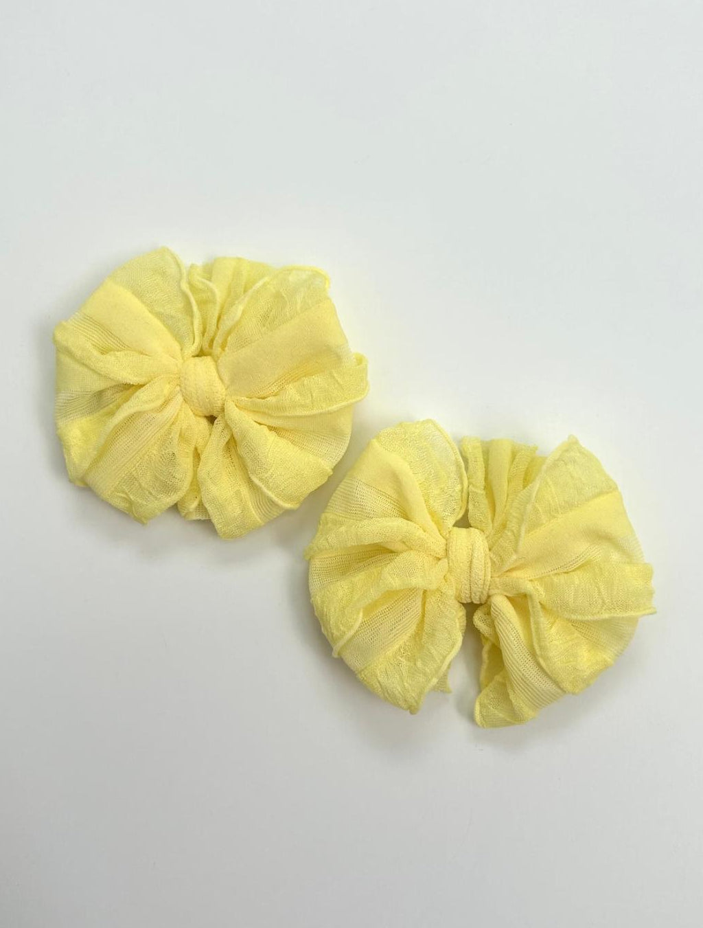 This delightful Ruffled Piggy Set in Buttercup adds a bright, sunny touch to your little girl's hairstyle! Crafted from our signature ruffled fabric, these clips feature a soft, textured design that brings a cheerful pop of color to any look. Each clip is securely attached to a metal clip and backed with soft felt for a comfortable, snug fit. Measuring 3.5 inches in width, these clips are the perfect size for pigtails, a timeless style that will stay adorable as your child grows. Keep your little one looking fresh and stylish with these lovely Ruffled Clips from Rockin Royalty!